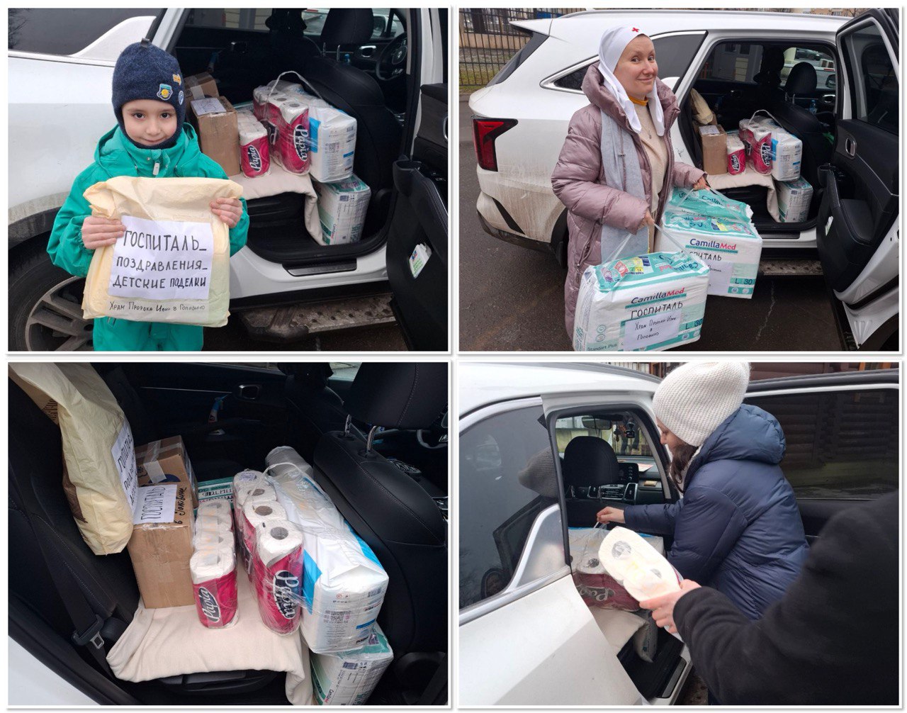 Мы собрали необходимые на фронте и в госпитале вещи, медикаменты, продукты и подарки. Одну часть передали в храм при Черкасской богадельне для отправки на фронт. Вторую часть отвезли в храм свт. Николая у Соломенной Сторожки для передачи в госпиталь.
